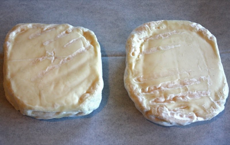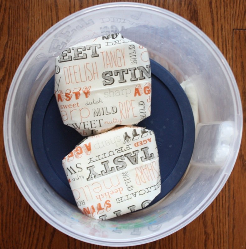 Apparently, if the brie ages without being wrapped, according to Anna Olsen (at Christmas in November 2011), the mold will grow into long bushy tendrils… but, there was no evidence of this that I could find. She and her husband started cheese making with brie, and decided that it was better to buy it after their forays with making it. Not my experience. I am in awe. Wrapping the cheese contains the growth of the mold, and it is important to turn each disc often. Both cheese discs sat on the lid.