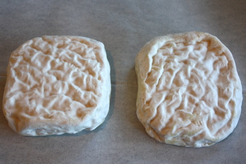 I kept them in the crottin moulds in the cave inside an aging box for over a week, and they just keep weeping. Why? I did unmould the knitted curd discs and place each on a mat, and within 2 hours they had spread to a frighteningly wide circular mass. I guided each mass back into a mould and continued to turn each regularly (two to three times a day) for the next week. Finally, I took each out of the mould in the ripening box, placed on a mat and below is the shape each formed. I continued to turn each daily. You can see the beginning of the white mold growing on the rind, as well.