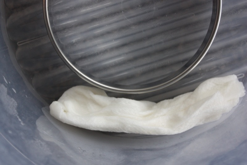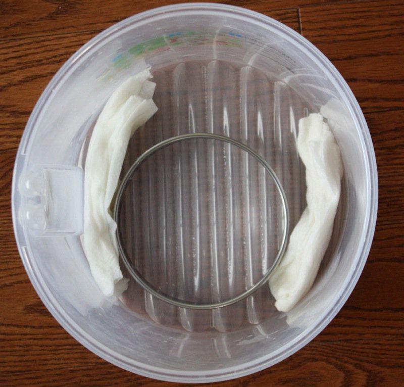 A ripening box is necessary for a cheese with aging with mold to eliminate cross contamination in the cave. To keep the moisture level high in the box, I soaked paper towels with water, and added a skiff of water to the corrugated bottom of the ripening box: perfect for this purpose. I placed a bakery ring on top of this to provide a breathing space, and a flat lid on top of that, that let the air circulate completely around it. The ripening box itself has a couple of air vents in it.