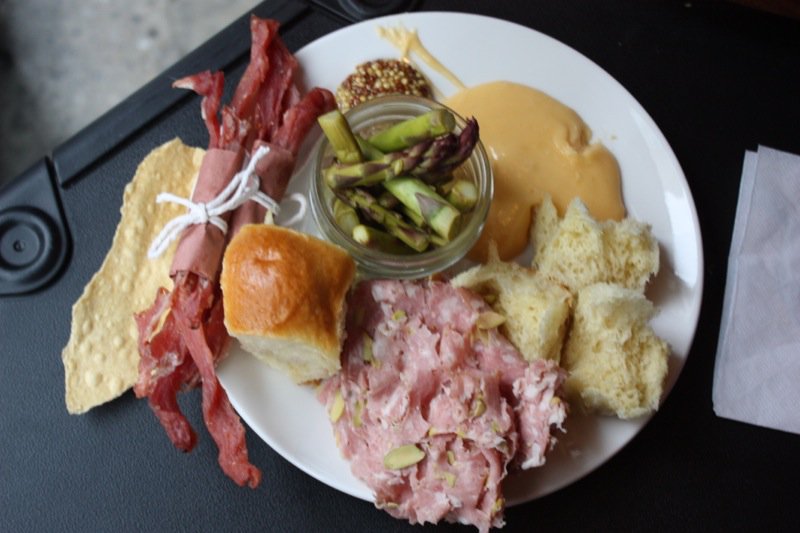 Karlynn accompanied me and we entered a bit early: the room already teeming with that palpable vibe of the beginning of Summer… and a great evening about to unfold. Massive boards laden with a variety of house-made charcuterie and preserves positioned themselves prominently throughout the room. Servers frequented the floor with icy platters of frothy beer and cold cocktails. Hello? Was there any desire left unquenched?