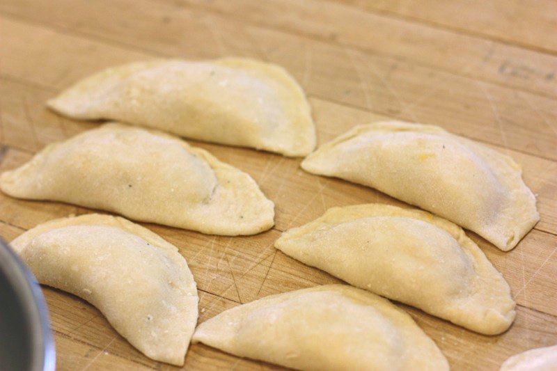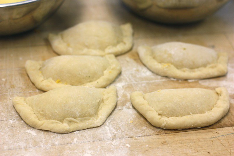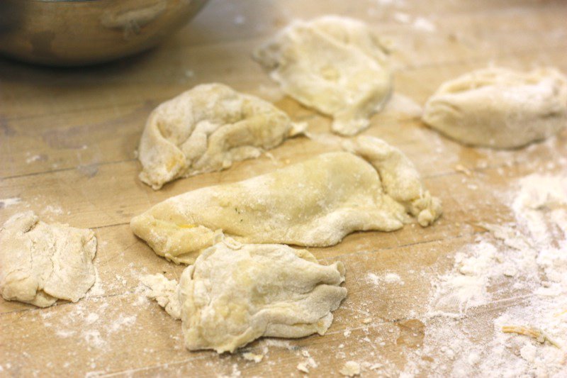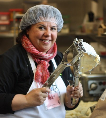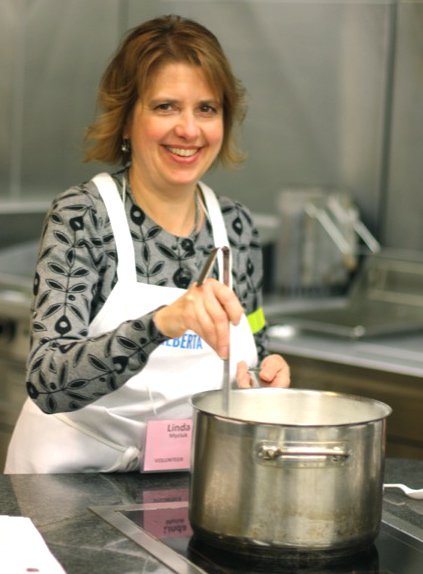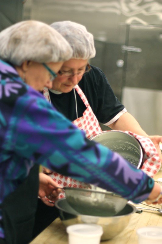 Pyrogies are a part of Northern Alberta’s cultural heritage. Chef David Omar from Zinc came prepared with much more than we were ready for, but our volunteers seemlessly moved in and helped out. Joveena, below, one of our dearly loved Senior Volunteers, with Little Miss Andrea et el, still grinning after peeling, boiling and ricing about 10 kilograms of potatoes for the filling. Participants were full of good will, teasing one another shamelessly, as they worked to hone their pyrogy making technique.