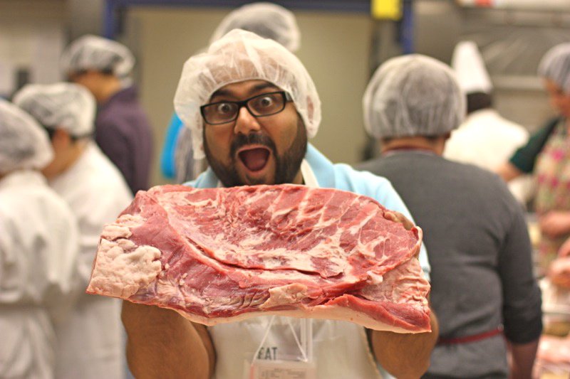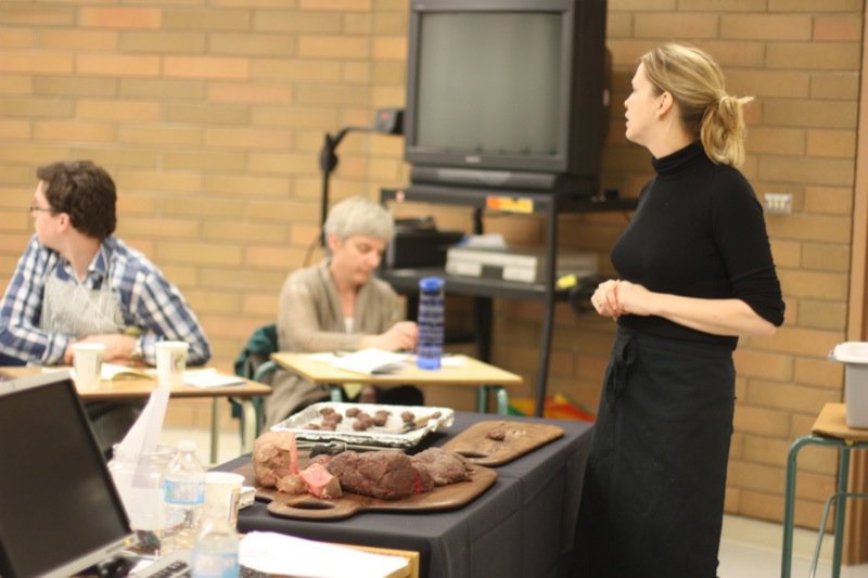 Chef Chad Moss’s class was a first for Eat Alberta: make your own bacon. He did a tasting and won over the crowd with that. “I can taste the chemicals in this one.” Participants ranted as they compared the tastes of homemade bacon to those that are mass produced. Small shops in the city will even smoke your cured slabs for you, for a nominal fee. I get mine done at the Budapest Deli. Irving’s Farm’s beautiful Berkshire Boar pork belly was on centre stage in this class. Making your own food with meat you buy at the supermarket can take you down the wrong path. Know your farmer, remember?