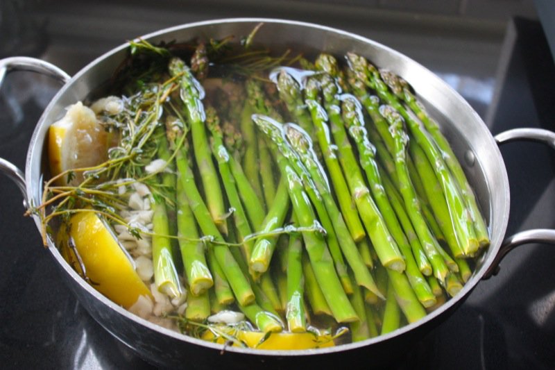 - Place lemons, thyme, minced garlic and juice into pot large enough to hold asparagus and water