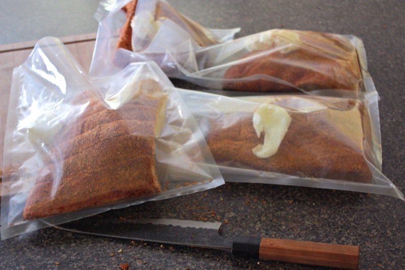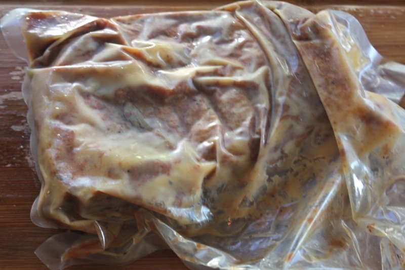 I cut it into four even pieces to portion the servings and to enable the meat fitting into my bags; added a little duck fat. Could not resist.