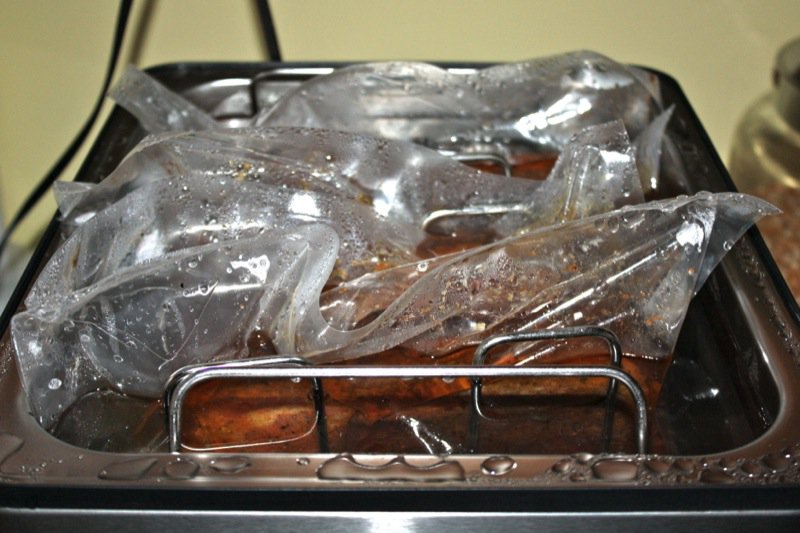 - Place 4 portions in the Sous Vide machine, using the vertical racks to place them evenly in the water bath, and put lid on the machine