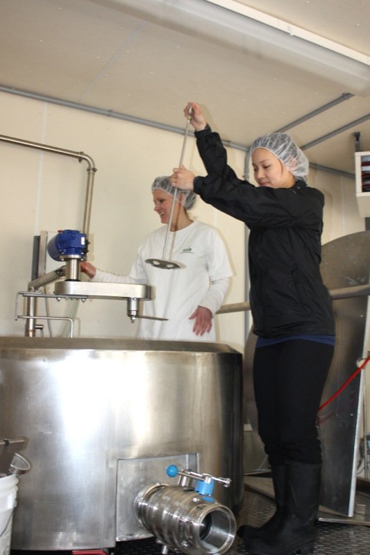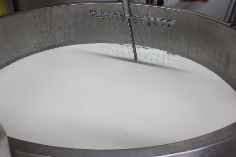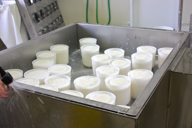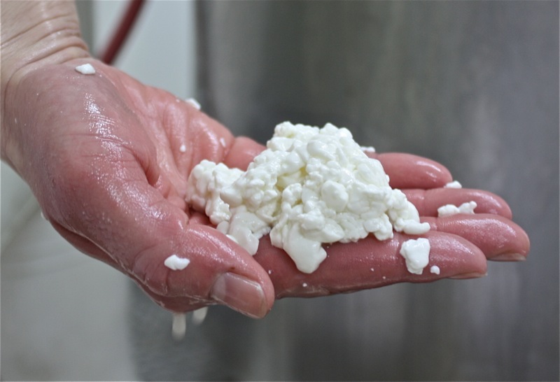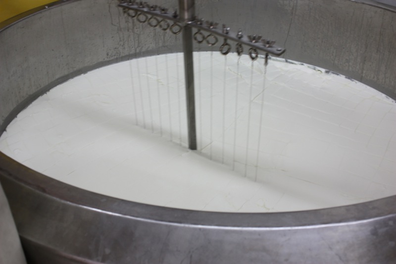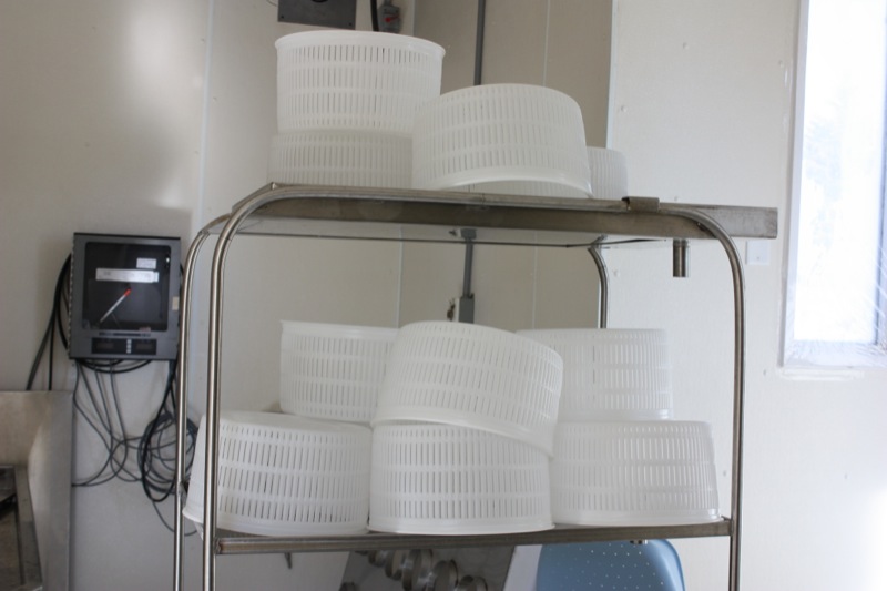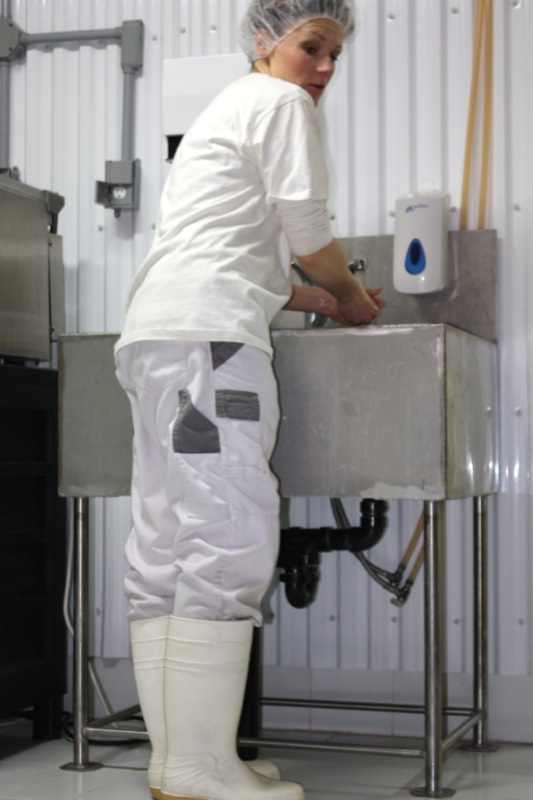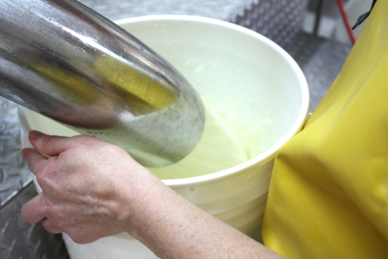 Sour milk. That is the scent that greeted us upon entering the door of the cheese making facility. It was faint, but to weak-kneed me, held me at attention. Rhonda had us change into inside clothing and water proof sanitary footware before crossing the threshold. Once inside, the bright, spacious rooms were spotless, airy and I was wondering if I had imagined the initial sour scent. Hair nets donned, aprons on, we washed up. More times that I can count. And that is a good thing.