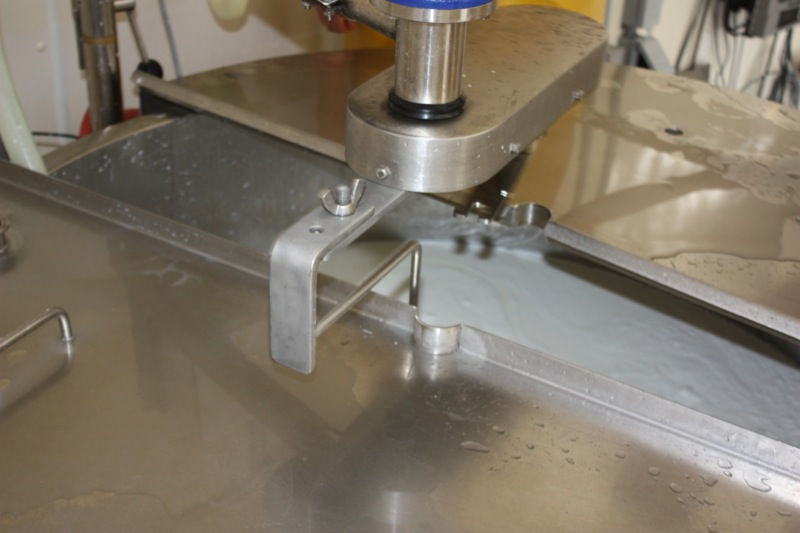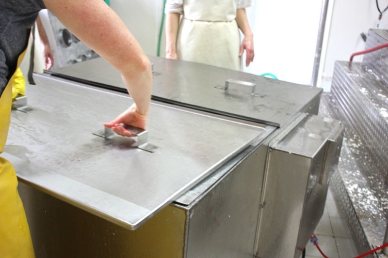 While we wait to add the rennet, we tour the facility. This room is the fresh cheese aging room and hasn’t been set up yet for the season. Guess what the troops did after lunch? It is kept very moist, with a 20% solution salt brine in the tub and at 9°C. The cheese is kept here for the first 48 hours. Sadly, Rhonda had to throw away her brine as she thought it may have been contaminated at the end of last year, and had to be safe. Usually, a cheese maker uses the same brine for life. I have mine.