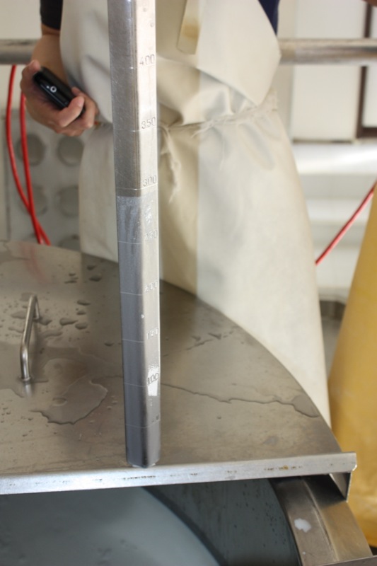 Time to close the vat and let it heat up the milk to 20°C. It usually takes about an hour to reach the correct temperature needed to add the cultures into it. You will see that Leslie is measuring the litres of milk in the vat so that Rhonda can calculate the culture and rennet amounts: 290 litres.