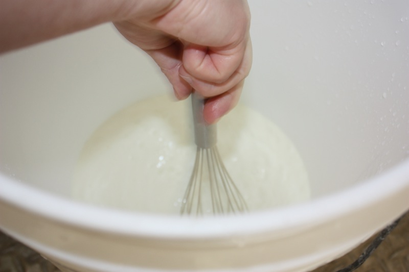 - Mix the rennet with 1/4 cup sanitized water; add to the warm milk in the vat, stirring 20 times in an up and down, plunging motion to combine
