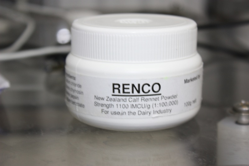 In it all goes, the vat is again covered and the milk left to rest with the culture for another hour before adding the rennet (15mL per every 100 litres). Rhonda uses the real calf rennet, pictured below.