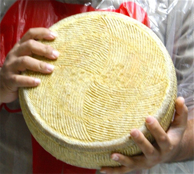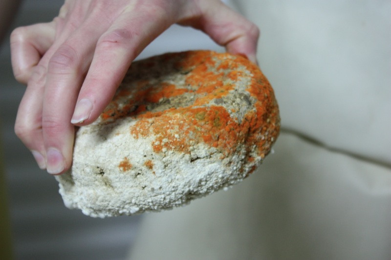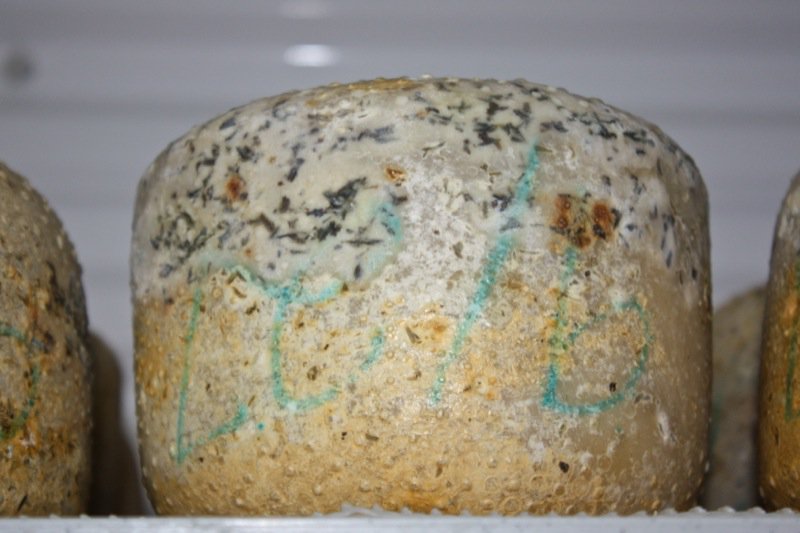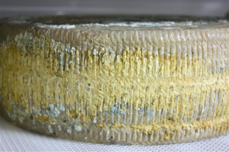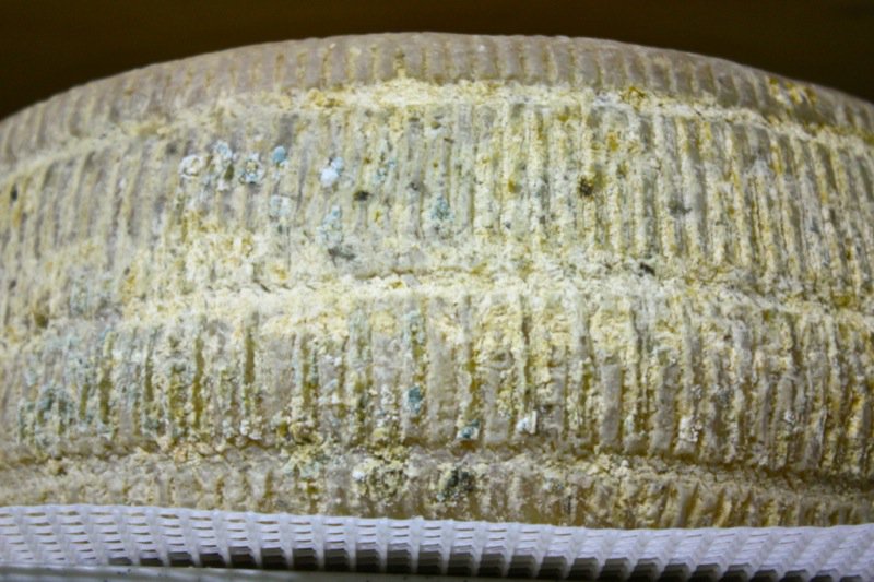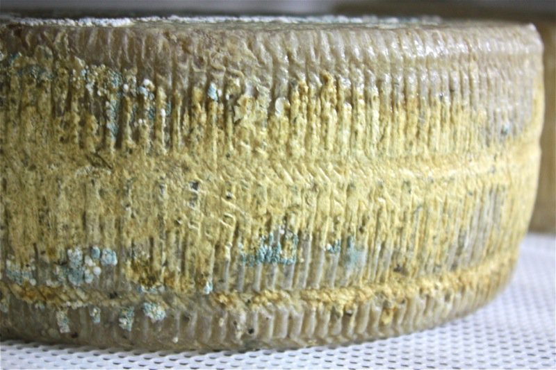 Apparently, the bright orange mold is safe to eat. She gets unusual molds like this tested. As she tests her cheeses, it is clear some are “better than others” according to her palate. Yet, it is really up to the sheep and their milk. Being able to produce a cookie-cutter-consistency in the artisan cheese making business is not possible, and not even sought after. Still, Rhonda has enough control over her animals, what they eat, and her product, to ensure a very high quality of texture, or paste, and flavour. Look at the gorgeous wheel below; the basket mould used is one of my favourites. I don’t have it, and my 14 litre vat is too small to fill it. It must take 30 litres of milk to fill this mould.