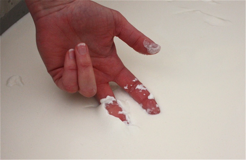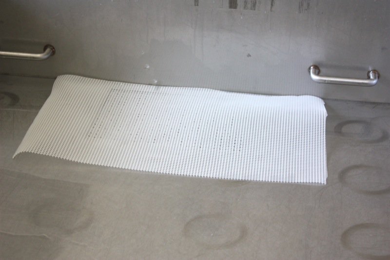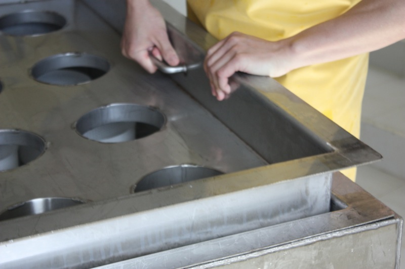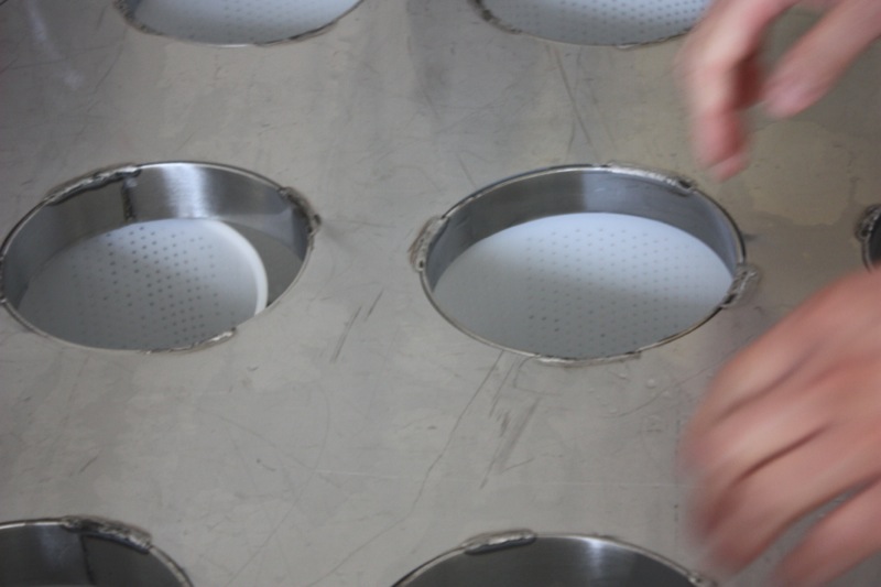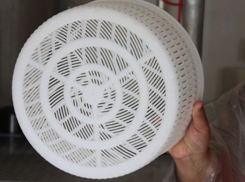 Above, my favourite basket mould. Below, removing the lining from the 24 hole cheese mould table to clean.