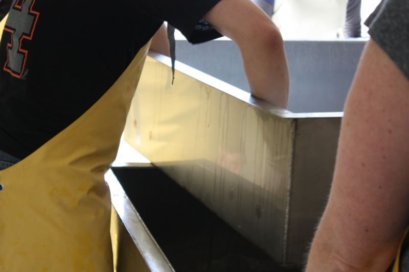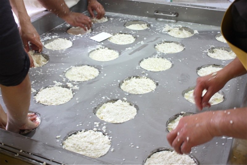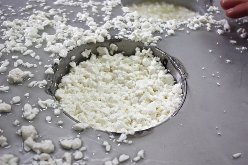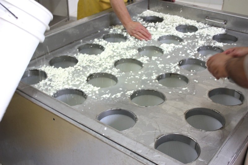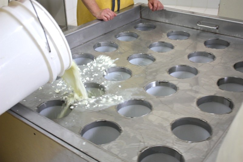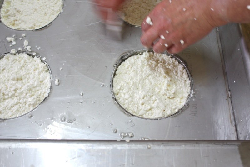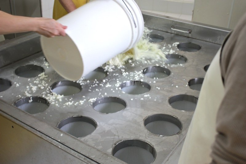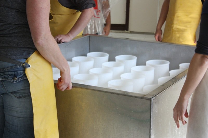 Once all of the curds were filled into the moulds, Rhonda drained the whey from the bottom of the table and poured it over the moulds again, to catch every curd possible.