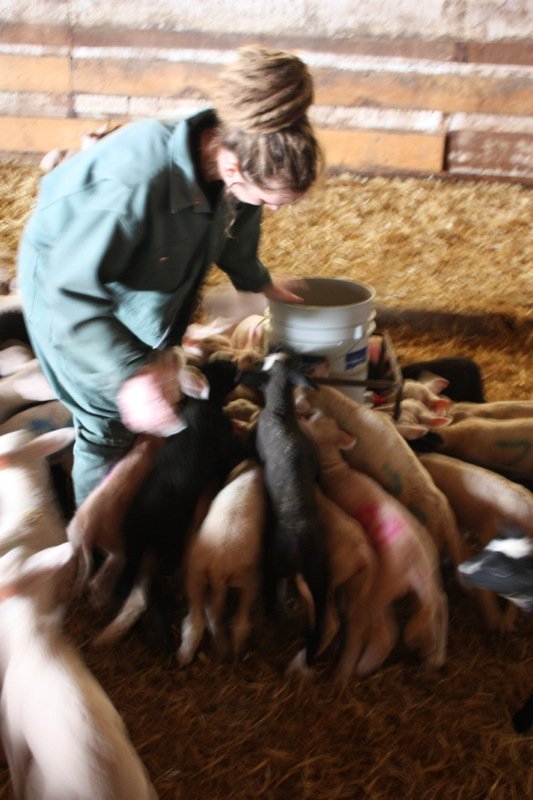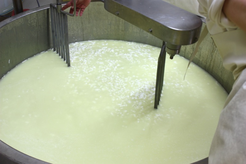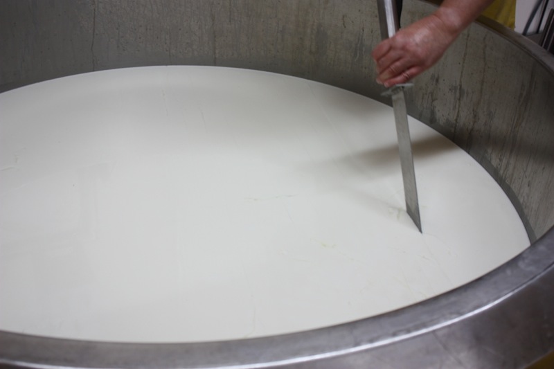 The curd wasn’t setting. This is not so unusual with the first milk of the season. We added a bit more rennet, took off our sanitary inside clothes, had a wee break outside and went for a tour of the barn and farm.