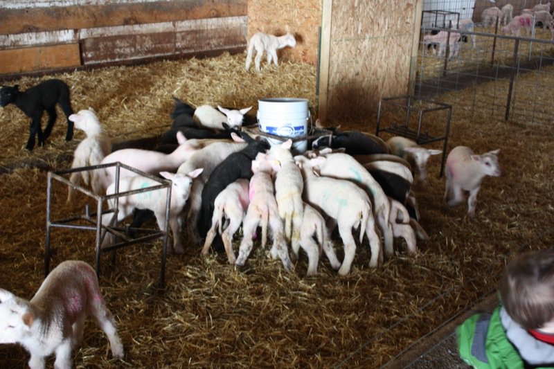 The lambs below are 2 days to a couple of weeks old and it is difficult to get their milk to them, as they are so hungry.