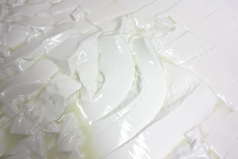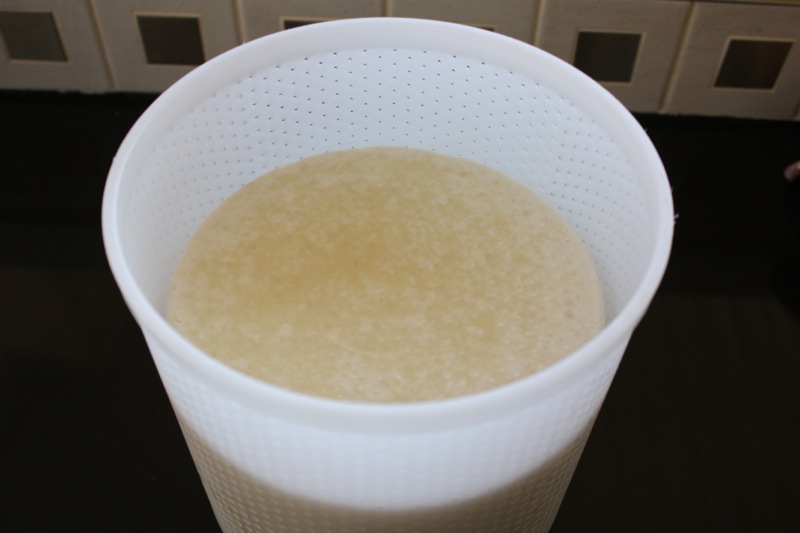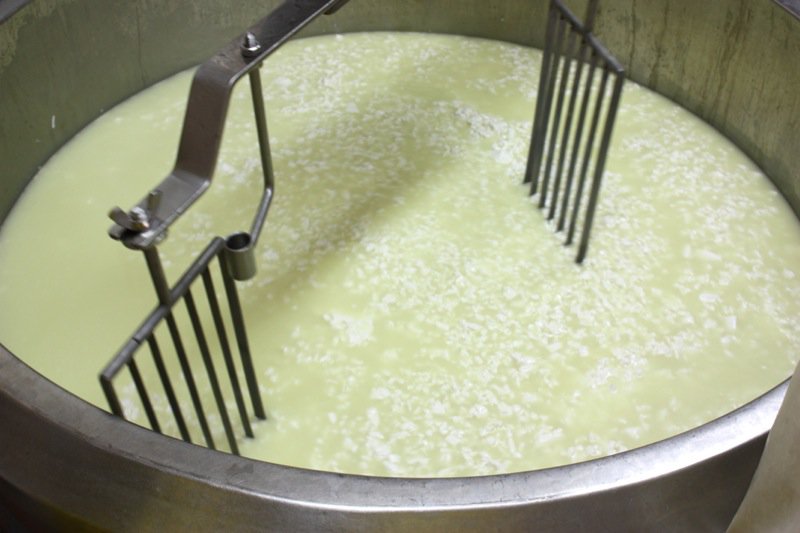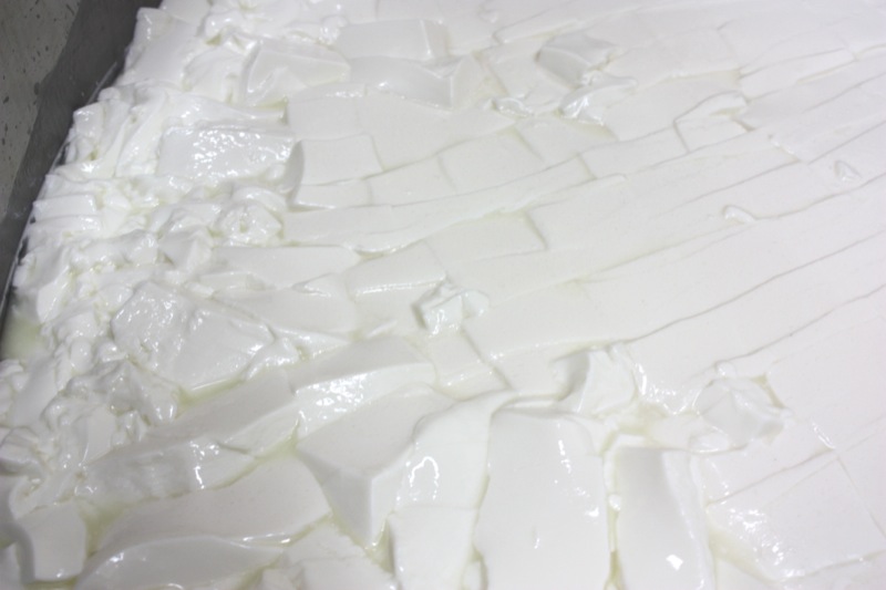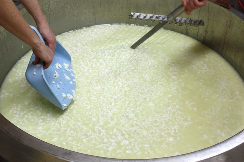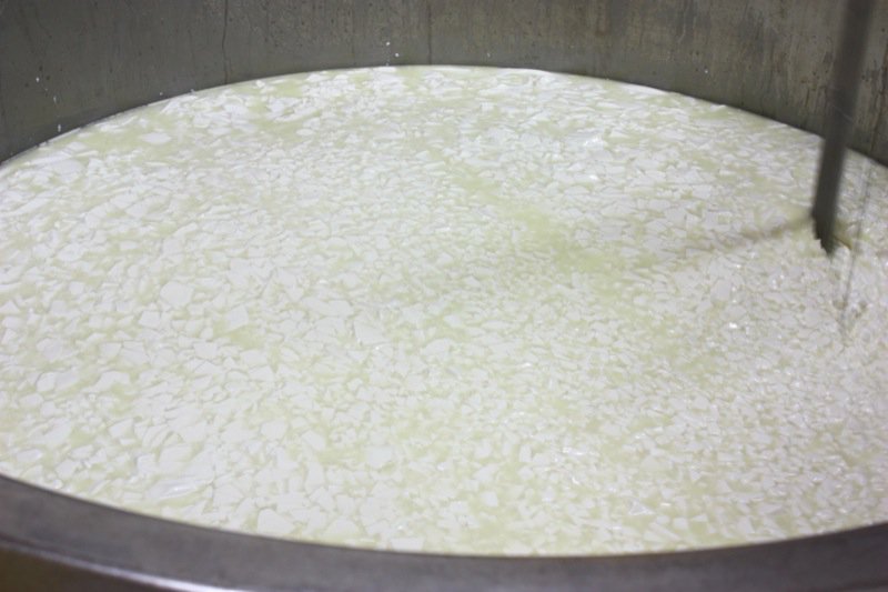 - Continue to cut the curd until the size of green peas: the whey will be greenish and the curd will be very small