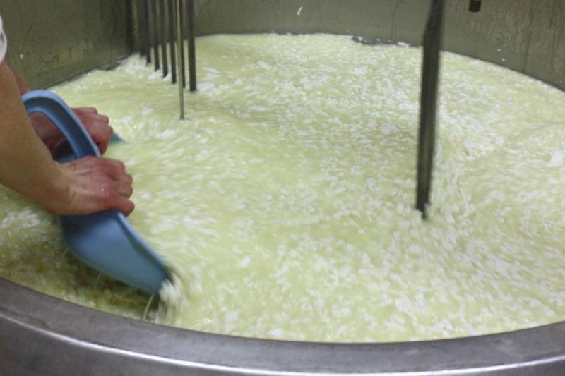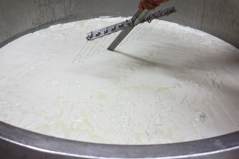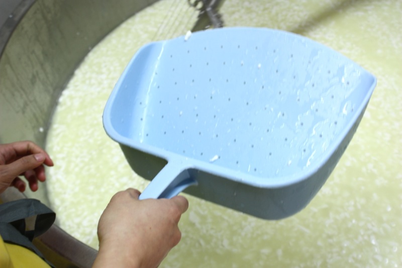 The curd excites me every time. The huge, lovely, gelatinous curds are somehow ethereal. When making any hard cheese, the curd must be very small. The smaller the curd, the harder the cheese; thus, the cutting of the curd was a process that didn’t take long with our group, but would be labour intensive with one or two working at it.