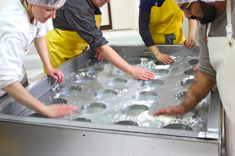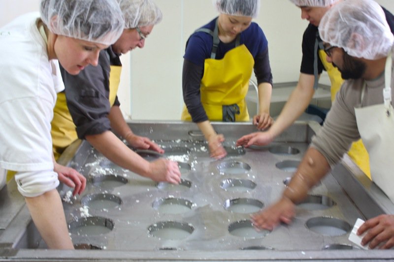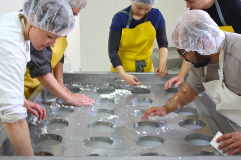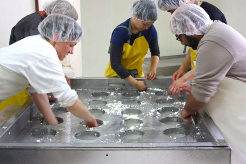 Many hands around the table made potting the cheese easy work: scoop the curds into the moulds and press the curds in each mould.