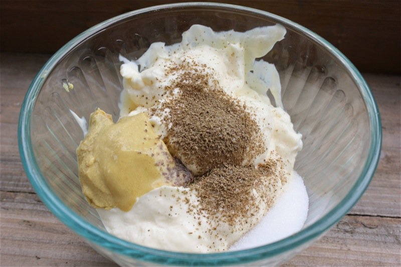 My recipe is very different using lots of seasoning like celery seed, pepper, maybe a touch of cayenne and whatever else strikes my fancy. I also use whipping cream mustard, a touch of mayo and I will occasionally add bacon to the mix. Not every time but once in a while it is a nice change.