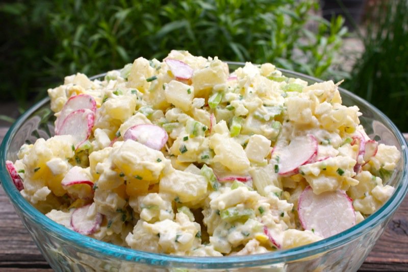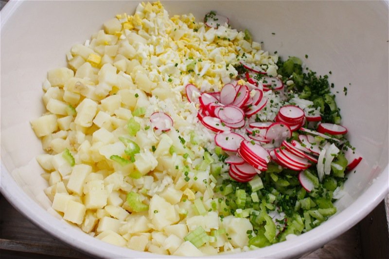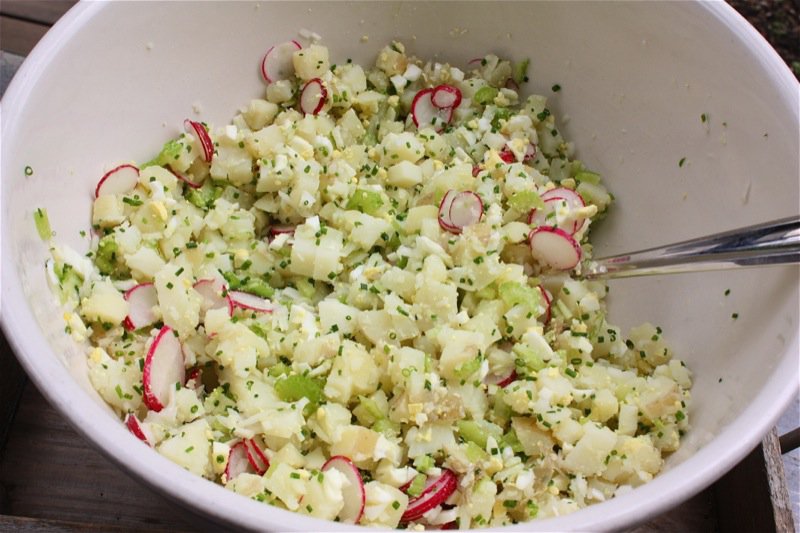 It wasn’t until a large extended family potluck picnic that I realized that all potato salads were not equal. Those family potlucks were feasts that medieval kings would have envied. Most relatives still farmed. We would get together at least once a year, toting culinary triumphs in coolers or cooking them up on Coleman stoves on site. Picnic tables were pulled from all corners of the park, lined with all pattens of cloths. I am sure that picnic tables are now cemented in because of our extended family outings. Children would play hide-and-go-seek, tag, and swing for hours. The adult men would play horse shoes, visit and smoke too much. The women? Finished the onsite food preparations and laugh a lot. There was always fried chicken, potato salad, chocolate cake and apple pie. Too young to know better, I asked: “What is that?” pointing to other potato salads that would obviously be a potato salad to a more experienced eye. Mom placed some of each on my plate so that I could sample them all. One was so yellow it looked like a lemon salad. Another had hardly any mayo and was very dry and crumbly. One just tasted so terrible that I had to turn my head and spit it into my napkin when no one was looking. Of course, my mom was looking. One thing they all had in common were potatoes, eggs, radishes, onions, celery and mayonnaise. It was remarkable to me, even then, that with so few ingredients, each salad could taste so different. My mom’s was better ‘n all the others. No question.