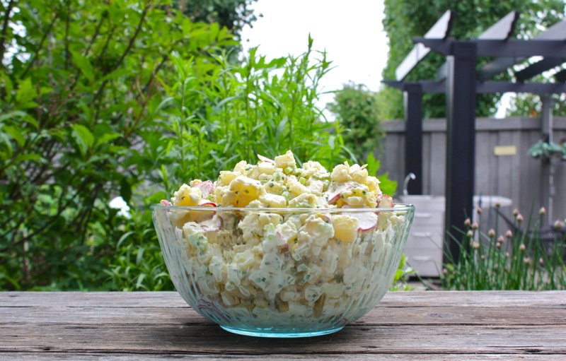 The first potato salad of the season said it all: Summer had arrived. Concocted with the Spring harvest of radishes, farm fresh eggs, chives from the garden and a luscious batch of lustrous homemade mayo, the Melmac robins egg blue bowl crowned our little chrome kitchen table in all its homemade glory and heralded in the onset of Summer. That is just how it was. Simple. Delicious. Woven so tightly into the fabric of my Canadian prairie identity and so intertwined with the melodies of my childhood memories that my mom’s potato salad and the celebration of Summer and sun are folded into my taste memory, literally seasoning the flavours in the bowl.