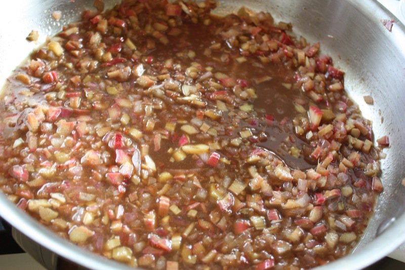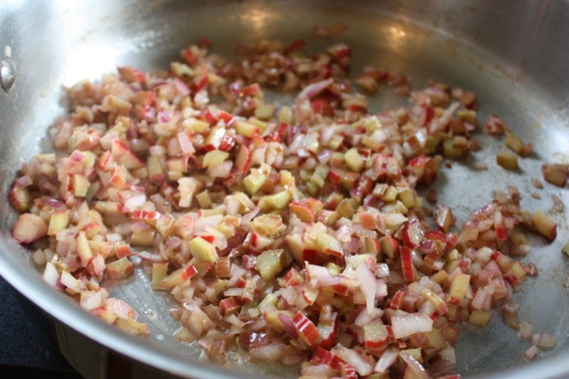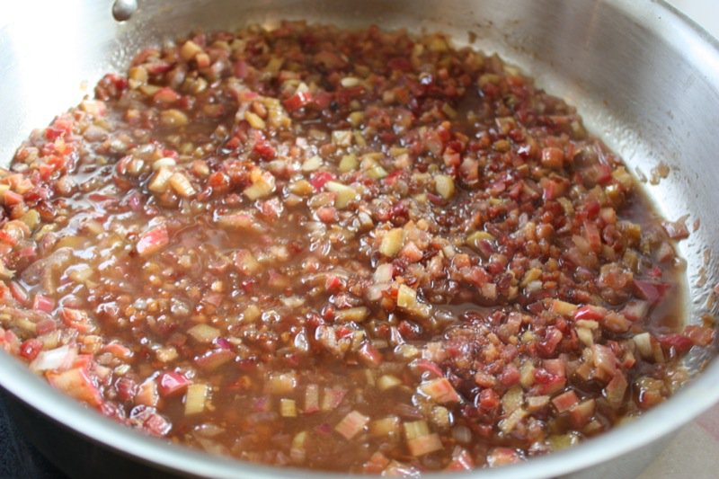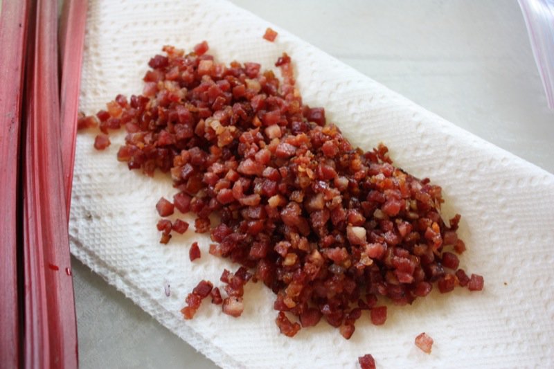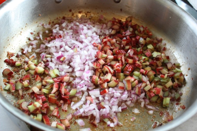 - Drain fat, if you have too much; add rhubarb and onions to bacon fat and sauté until onions are translucent and rhubarb begins to soften (no more than 5 minutes)