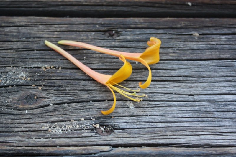 Pluck a petal; pinch the bottom part near the stem and gently pull it out. There should be a drop or two of nectar on the white “string” of the flower as you pull it out. Place it gently to your lips and suck the nectar. The Mandarine Honeysuckle, while a lovely bright orange, has no discernible scent. It does have a sweet swallow of nectar at the base of each petal which is why hummingbirds hover near the vines in the hot summer, long beaks sinking into petal after petal.