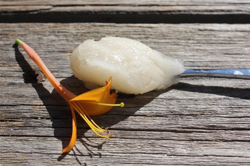Capturing the fragrance of the flowers in the water is the magic of this recipe. Honeysuckle vines grow wild in many warmer North American climates. In my zone three garden, fortunately I do grow the edible species: Lonicera Japonica. I have the Mandarin variety. It lacks a compelling fragrance, though the sweet nectar is nummy. The sorbet flavour from this varietal does not carry the ethereal floral notes that this sorbet is famous for. However, it is easy to make and was a great experience.