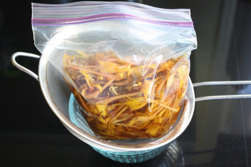 - Place blossoms in a ziplock bag and cover completely with the 5 1/3 cups of cold water; seal, ensuring all petals are immersed in water and leave overnight