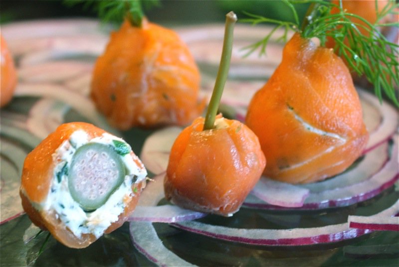 - Wrap a thin slice of salmon around each cheese covered berry, starting at the top, and angling down and around the berry
