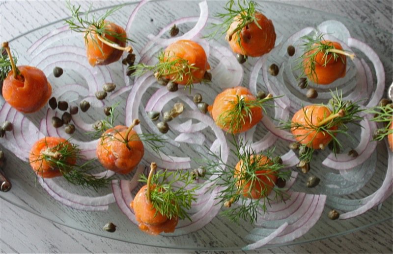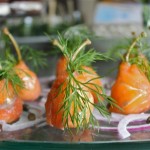 - Just before serving, unwrap "Smoked Salmon Pears", and insert dill fronds into the top of each pear beside the caper berry stem