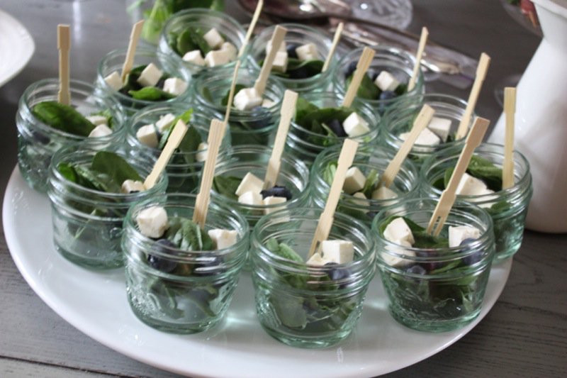 I confess. The salad took my breath away. Kristen has promised that I will be getting the recipe. Simple is sensational. The tender leaves of baby spinach with the plump juicy blueberries and the dainty cubes of soft cheese was all she wrote, and more than enough. The Balsamic vinaigrette dressed the salad for the party and the little forks and canning jars really set the tone. You may think it may not take much for me to get excited, but to come up with this kind of concoction for this kind of an event is not easy. It was so fittingly brilliant that I must just steal it