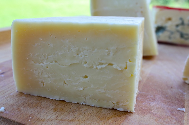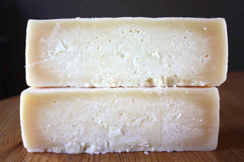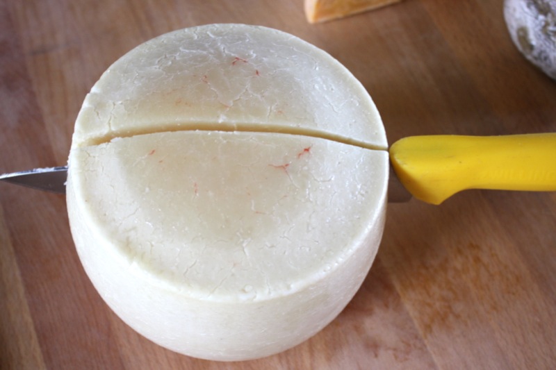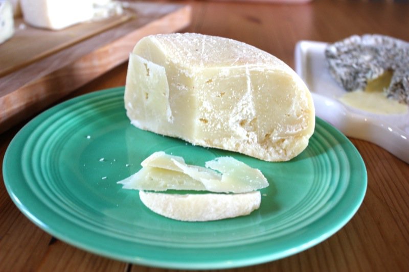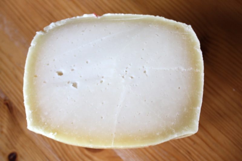 It has been so long since our last “official” Cheesepalooza Tasting that I had quite a collection of aged specimens that begged tasting. Cutting into each for the first time is absolutely thrilling. Above is the Pecorino I made May 4th, 2013. It is 11 weeks or almost 3 months old. I am delighted by the rind and the texture of the cheese. This one was not pressed, but turned every 15 minutes for about 3 hours, thus the eyes. When in Sienna, I bought a 50 pound wheel of young Pecorino and carried all over Italy with me, and then home. It was that delicious. This is not that delicious, yet. The texture is a bit rubbery, but it was still a bite of subtle Spring (below).