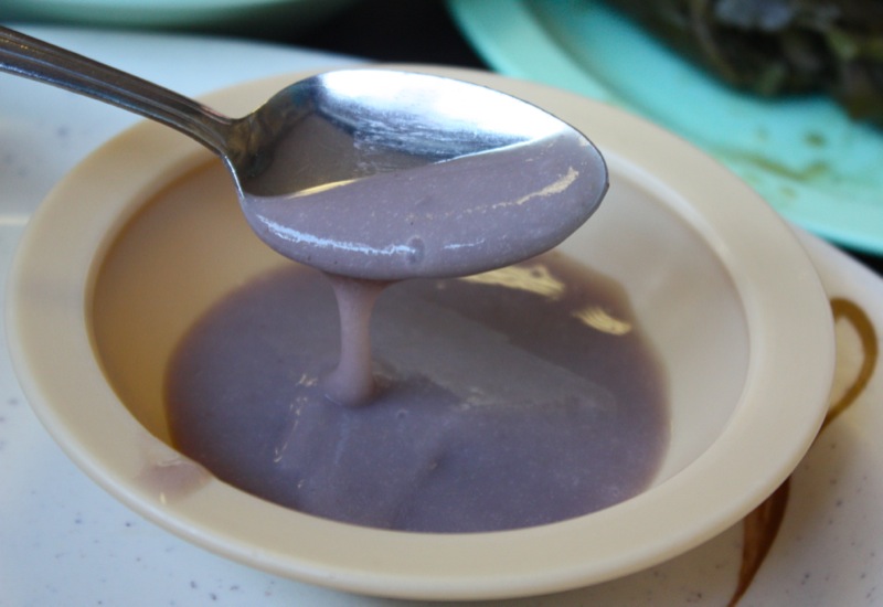 The son of the owner told me that this used to be a staple for all Hawaiian babies, and still is, in many families, so that it is something everyone just loves to eat. It is extremely nutritious and considered to aid in digestion. Therefore, it is eaten as a side, or dip, at every traditional meal, and a very important part of the taste and texture profile of traditional Hawaiian foods. Recently, research has suggested that poi may help fight colon cancer by killing cancer cells in the colon, and that italso benefits people with celiac disease. When it is fresh, it is sweet, but tends to become sour and bitter as it ages. Some people add sugar to it. I found it very bland and nondescript. I recall my mother coming back from Hawaii years ago making a wry face at the mention of it. To me, it was a little cloying and not flavourful. Knowing how nutritious it is would definitely motivate me to use it in cooking if I lived there.