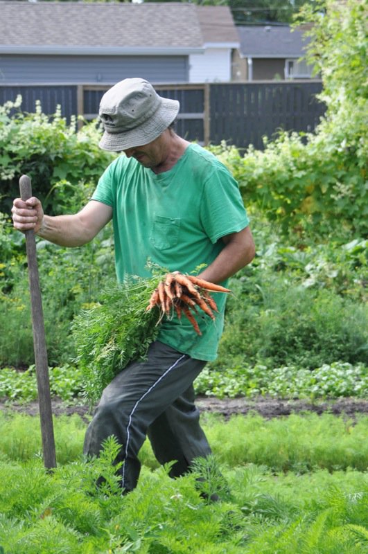 Deborah Vanston at In the stewing pot from Saskatoon, Saskatchewan has chosen Urban Grower and SPIN-Farmer Wally Satzewich as Saskatoon’s Food Hero. Deborah writes that a visit to one of Wally’s urban gardens left her longing to have her own. “I became completely immersed in a backyard of green hues and bright sunflowers that appeared almost surreal from the other side of the gate. Two thousand square feet of land converted into a lush and profitable garden with sprouting carrots, tomatoes, spinach, cucumbers, squash, rhubarb, sunflower greens, arugula, cilantro, dill, and what Wally refers to as “volunteers”: those edible plants that pop up among planted greens.”