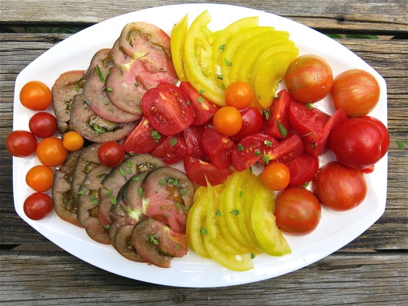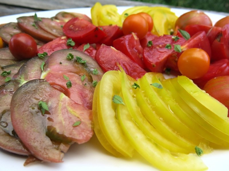 Freshly picked heirloom tomatoes, sliced and sprinkled with hand-mined sea salt and basil buds….