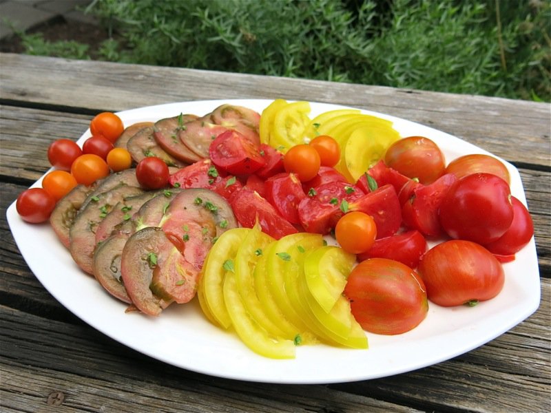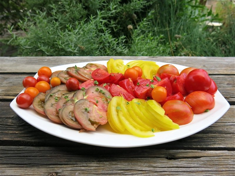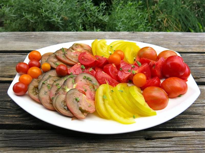My favourite, the Cherokee Purple, was hard to come by this year. The dark greenish red one on the platter, this year, is the Black Krim. It is very similar in appearance, not quite as big and not as dark as the Cherokee. It is delicious, and again, I didn’t compare it beside the Cherokee, but there hasn’t been a year when I have tasted the Cherokee that my eyeballs didn’t roll back in my head for more than a few seconds. This didn’t happen with the Krim, but it is still a very substantial, meaty and flavourful tomato.
