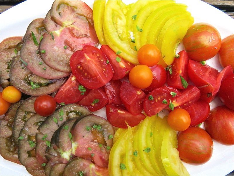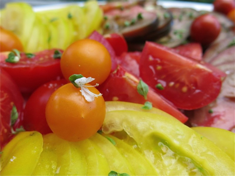I find a few basil flower buds (or flowers) with the sea salt and some gorgeous fruity olive oil is all that is needed to celebrate Mother Nature’s jeweled treasures. Tomatoes are my favourite food. I have never been successful at growing them from seed indoors, and used to have a gal who would grow what I wanted from seed and sell me the plants each Spring. I really miss that as I cannot access the varieties I have learned to love… of course, I always like to try new kinds of tomatoes, but there are some I want to grow yearly and would love to have someone to grow my plants for me in the Spring. Offers?