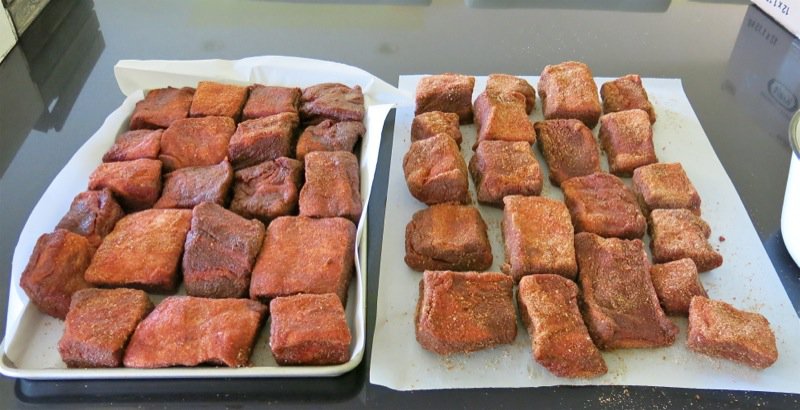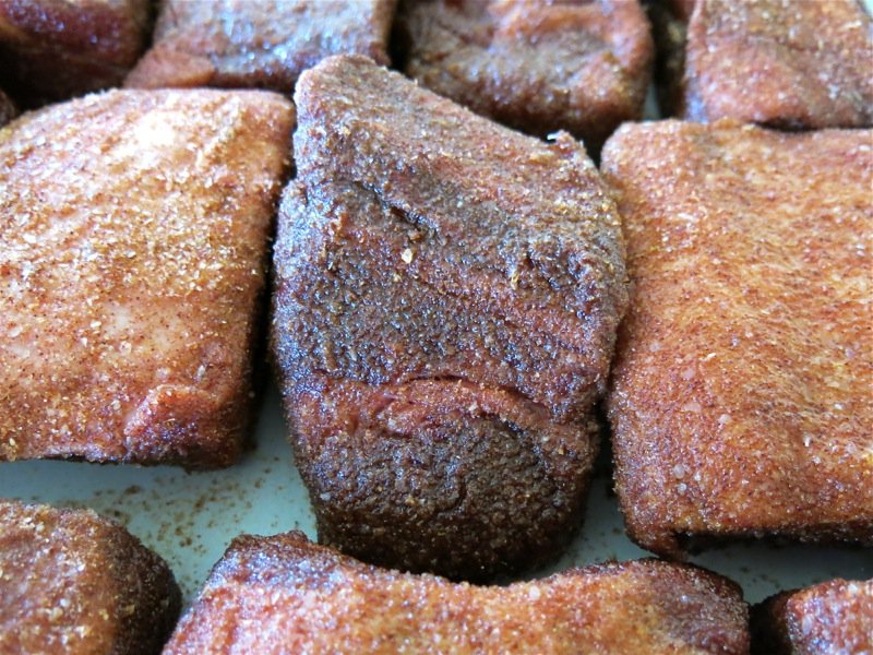 Dry the ribs with paper towel first, then press the meat into the dry rub; once all are covered, press into the dry rub a second time.