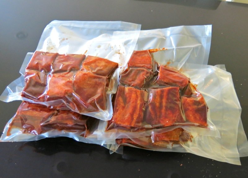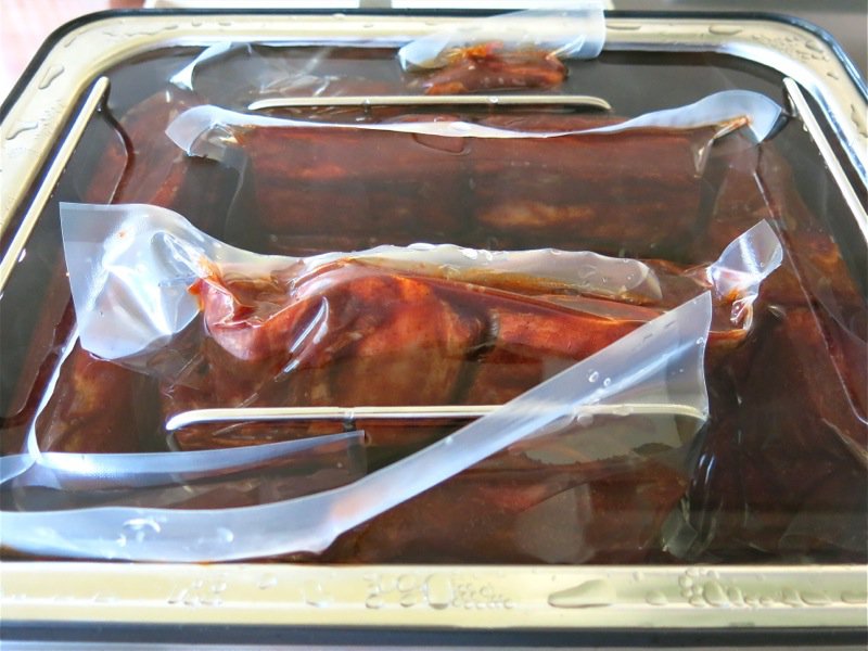 - Put the ribs into large (gallon/3.8 liter) cooking pouches and vacuum seal; place in the water oven, fully submerged