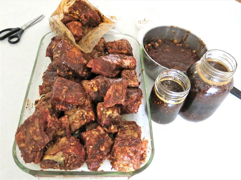 You will see below that I reserved the juices in the pot on the top right. I cooked them until they had reduced to about one third in volume and then threw it out. Not good. I used the large jar of marinade and poured it over the ribs about 45 minutes before they hit the grill, turning them about every 15 minutes to ensure all sides were attended to.