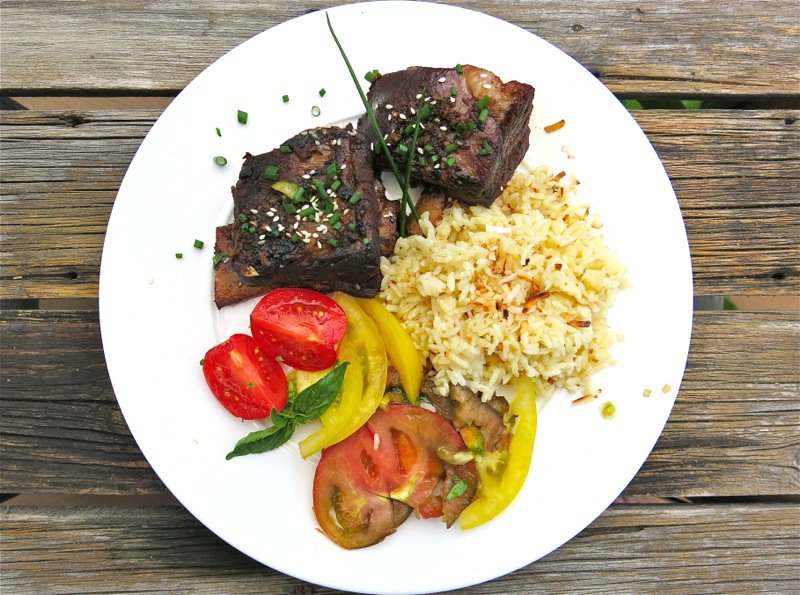 - Arrange short ribs on a platter and garnish; serve with coconut rice and a salad