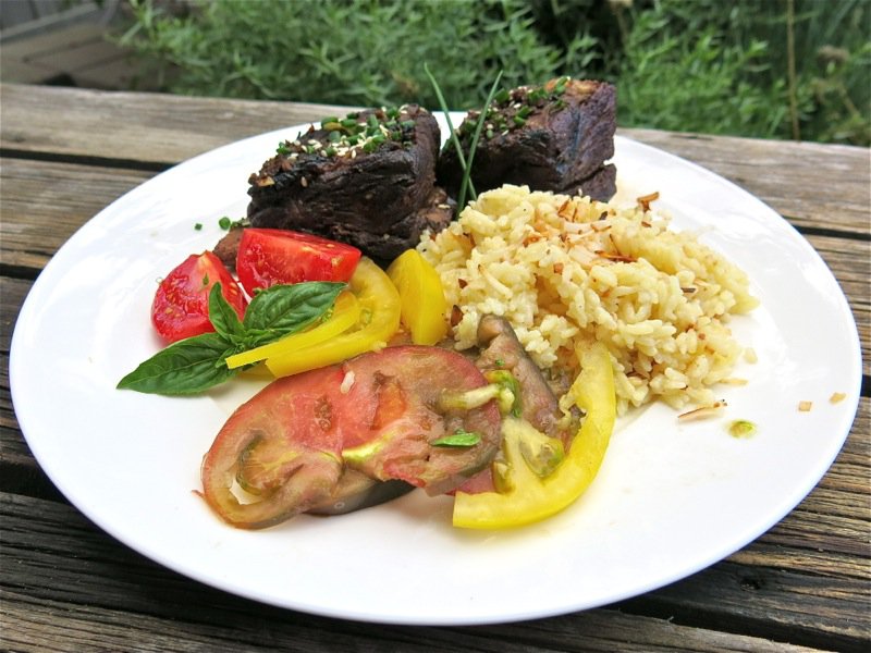 I confess, the photo above is the meal we had with the left over ribs after we came home. The meal I served while away was a flurry of flying fork festivities, so the photos are few. I served them on the platter below, after Vanja finished them on the grill to add that charred flavour and texture. A coconut rice and the retro Seven Layer Salad were the accompaniments. Home, the rice was accompanied with our gorgeous Heirloom Tomato Salad Plate.