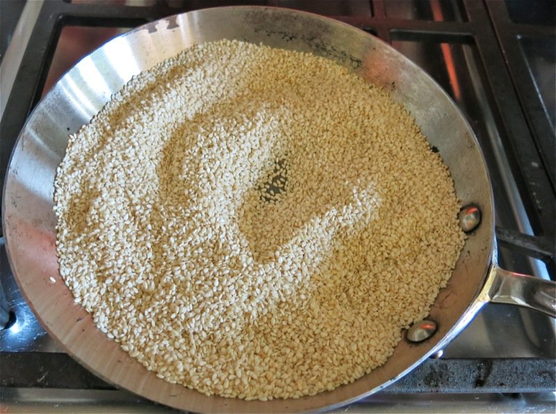 Toast the sesame seeds next. Do not take your eyes off the pan. Stir and sniff constantly.