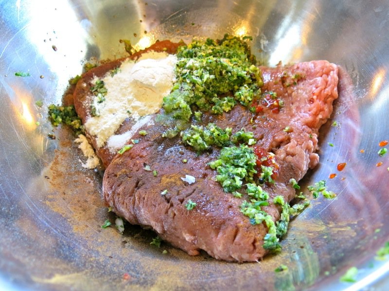 I used ground turkey again… potato flour, a bit of Sambal Olek and cinnamon worked together into balls.