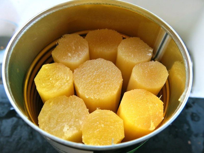Fresh sugar cane is nicest and can almost always be found at your local Asian grocer. This day, they were out, so I used canned, and quartered each. You can have it cut to your desired specifications at the grocer, as well, which is lovely.
