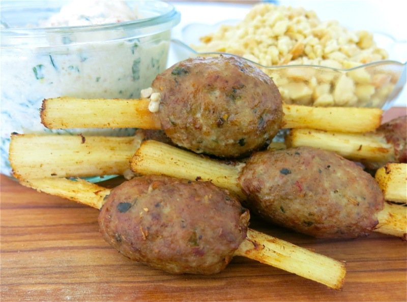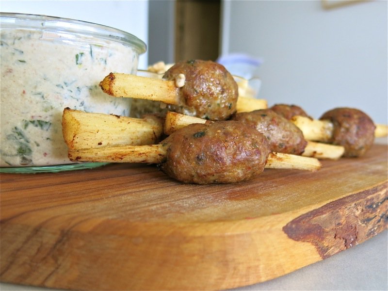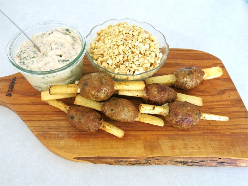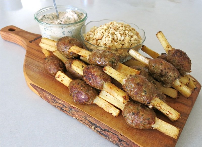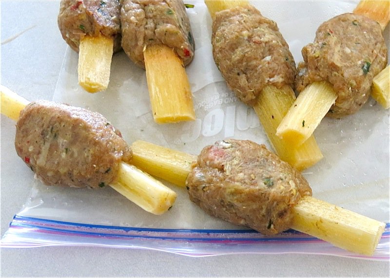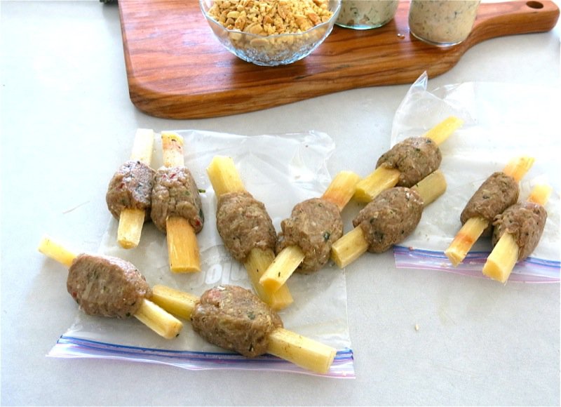 I have made this recipe many times, but never shaped the meat on a stick like this, before. I have made simple meatballs with this recipe, that are deadly delish. I have also formed the meat into a thin cylinder around the end of the sugar cane skewer, which is then all about the dip and the skewer, as the meat is fried very quickly and there is much less of it. I believe this recipe is best with the meat formed into into meatballs as it is much more juicy that way.