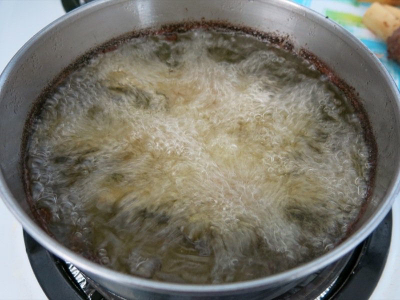The meatballs are usually deep fried, which was easiest, and works well when on the sugar cane skewer. These are also delicious on the grill. I use foil punched with lots and lots of holes so the meat doesn’t stick to the grill, but the grilled flavour still transfers to the meat. They are also nice grilled in the oven, but not as good as the other two ways.