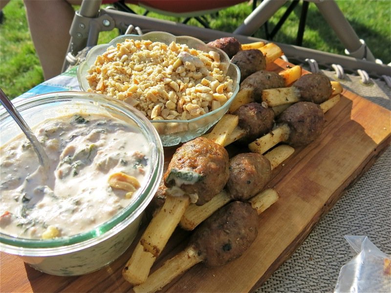 Appetizers on the beach at Mara Lake August 2013 between 4 to 5 every night. This was “meat on a stick”, night two. I made Dukkah Turkey Skewers with Yogurt Cheese Balls the first night.