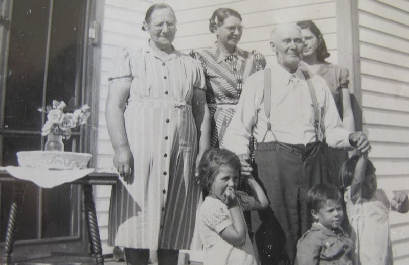 In the black and white photo my great-grandmother is standing beside the cake. I remember her wide and loving smile as she would wrap her wrinkled and flappy arms around me. Her bosom was ample and tired and soft, and a wonderful place to be. She had given birth to 13 children through her long life and had her two eldest beside her with her husband and some of her grandchildren in this photograph. My grandmother, Maude, was somewhere in the middle of this clan, born in 1898. My great grandfather had died before my birth.